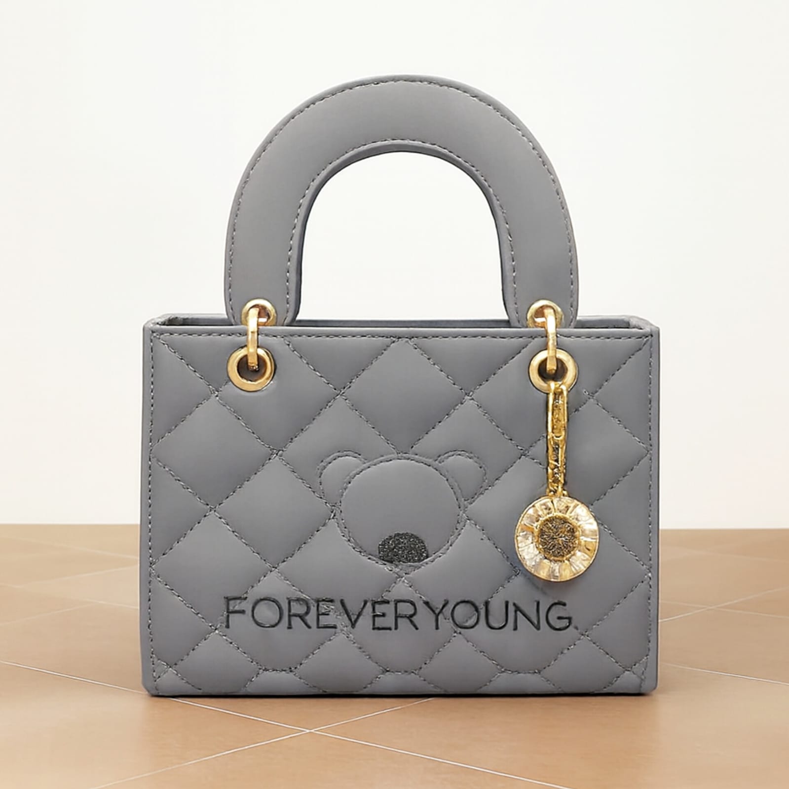 Stylish Quilted Hand Carry Box With Gold Accents, Embossed Bear Motif, And Detachable Long Strap For Versatile Use.